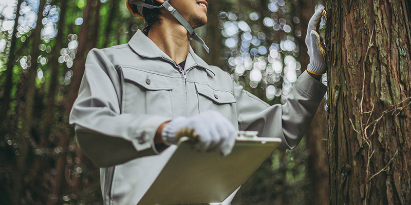 林業は、苗木を植え育て、育成した樹木を伐採して収穫し売る産業です。木を収穫した後には、再度苗木を植え新しい木を育てます。収穫を迎える50~60年間、大切に世話をします。この一連の作業を林業従事者が行います。